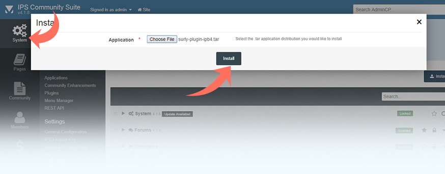 Go to System → Application. Use the Choose File dialog to add Sur.ly archive and then click Install to activate it on your site.