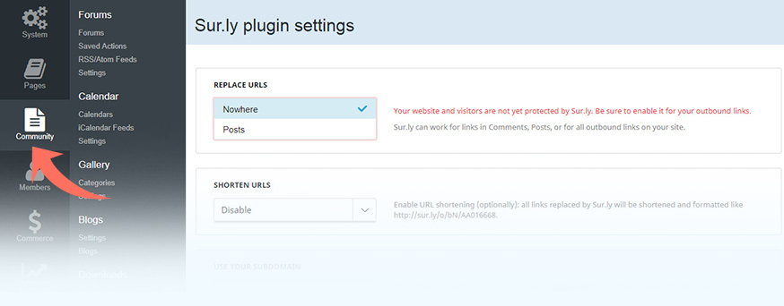 Go to Community → Surly to access the plugin settings.