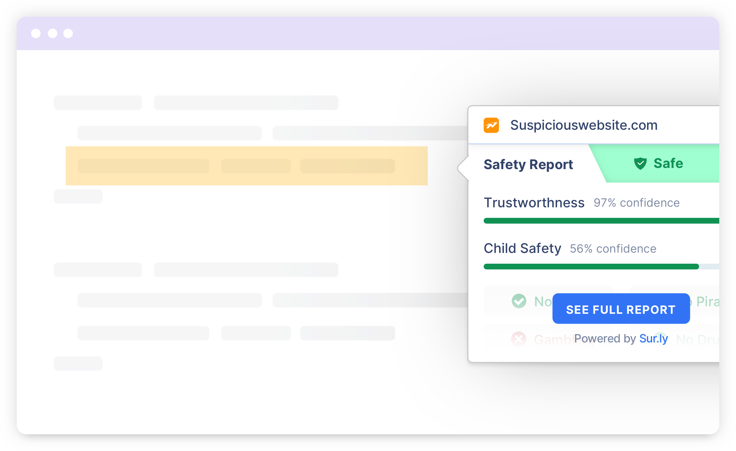 Sur.ly makes its best to protect users from many potential threats on the Web, including malware, scam or phishing pages, unsolicited adult content, etc. That's why Sur.ly Surfguard is connected to our own database of up-to-date web safety profiles: we use only credible public sources along with our comprehensive technology to research, determine, and bring together all vital safety indicators of any website.